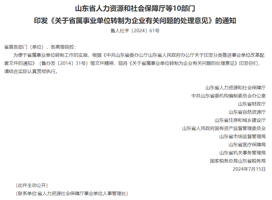 近日,山东省人力资源和社会保障厅等10部门印发《关于省属事业单位转制为企业有关问题的处理意见》,全文如下: