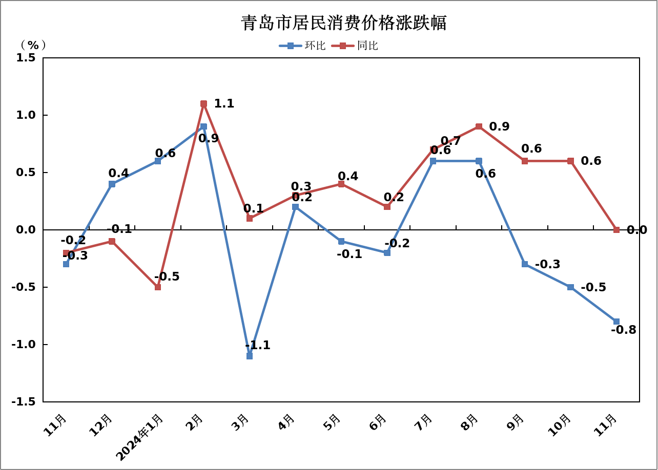 青岛日报社/观海新闻12月10日讯 国家统计局青岛调查队监测数据显示,11月,青岛市居民消费价格(CPI)同比持平,其中,食品价格同比上涨1.5%,非食品价格同比下降0.3%;消费品价格同比下降0.1%,服务价格同比上涨0.2%。11月份青岛市CPI环比下降0.8%。