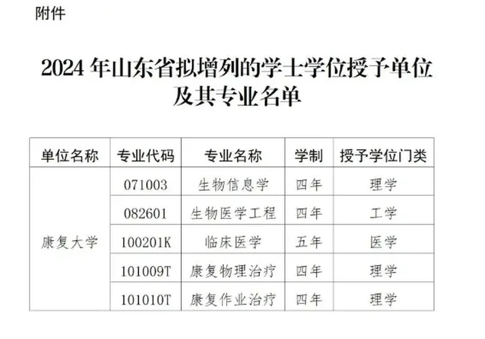 根据国务院学位委员会《学士学位授权与授予管理办法》和山东省教育厅山东省人民政府学位委员会《山东省学士学位授权与授予管理实施细则》相关规定,2024年12月11日—12日山东省人民政府学位委员会办公室组织专家组,对康复大学开展了学士学位授予单位及专业入校考察、评审工作。经专家评审,同意增列康复大学为学士学位授予单位,同意增列该校生物信息学等5个普通本科专业为学士学位授予专业,现按程序对专家评审结果予以公示。公示时间为2024年12月13日至2024年12月20日。