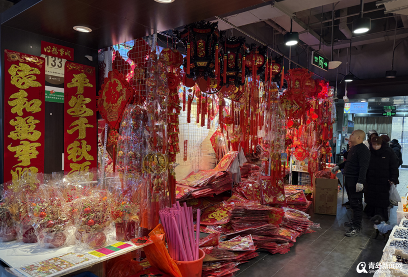 赶大集备年货,市南区的农贸市场、新春大集同样透着浓浓的年味。位于市南区南京路的浮山所农贸市场,这里已经遍布福字、对联等新春装饰。“从腊八开始,青岛人开始忙碌地准备过年。家家户户都要贴对联、挂福字、挂灯笼,红彤彤的装饰映衬着人们喜悦的心情,人们都沉浸在一片喜庆的氛围,共同迎接新年的到来。”一位消费者介绍。