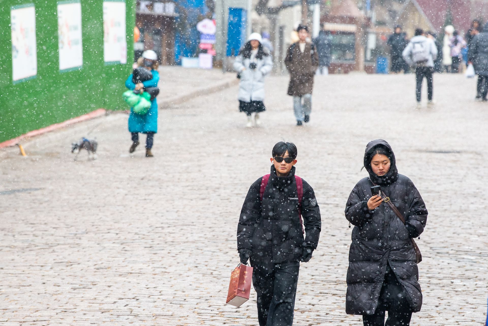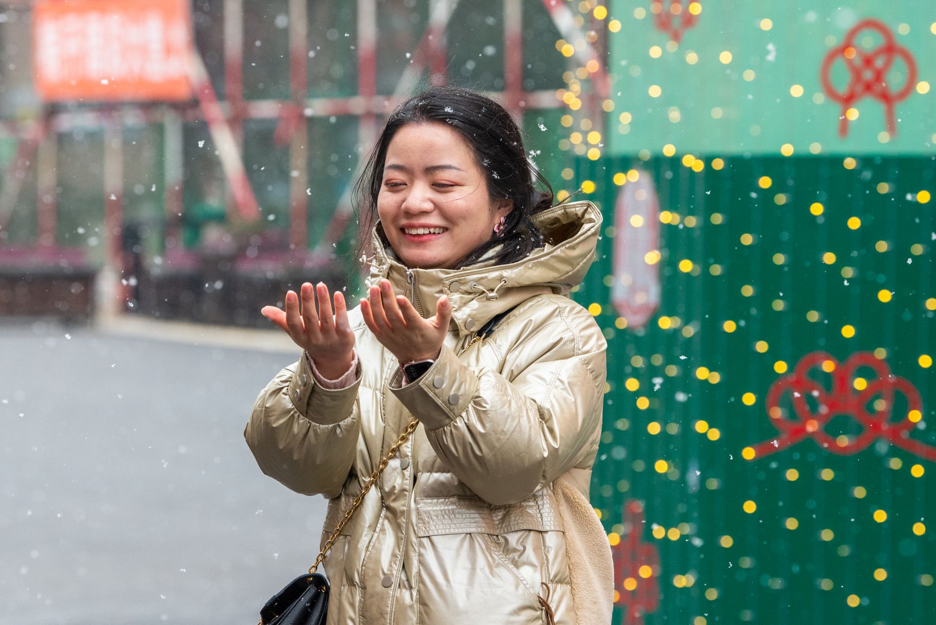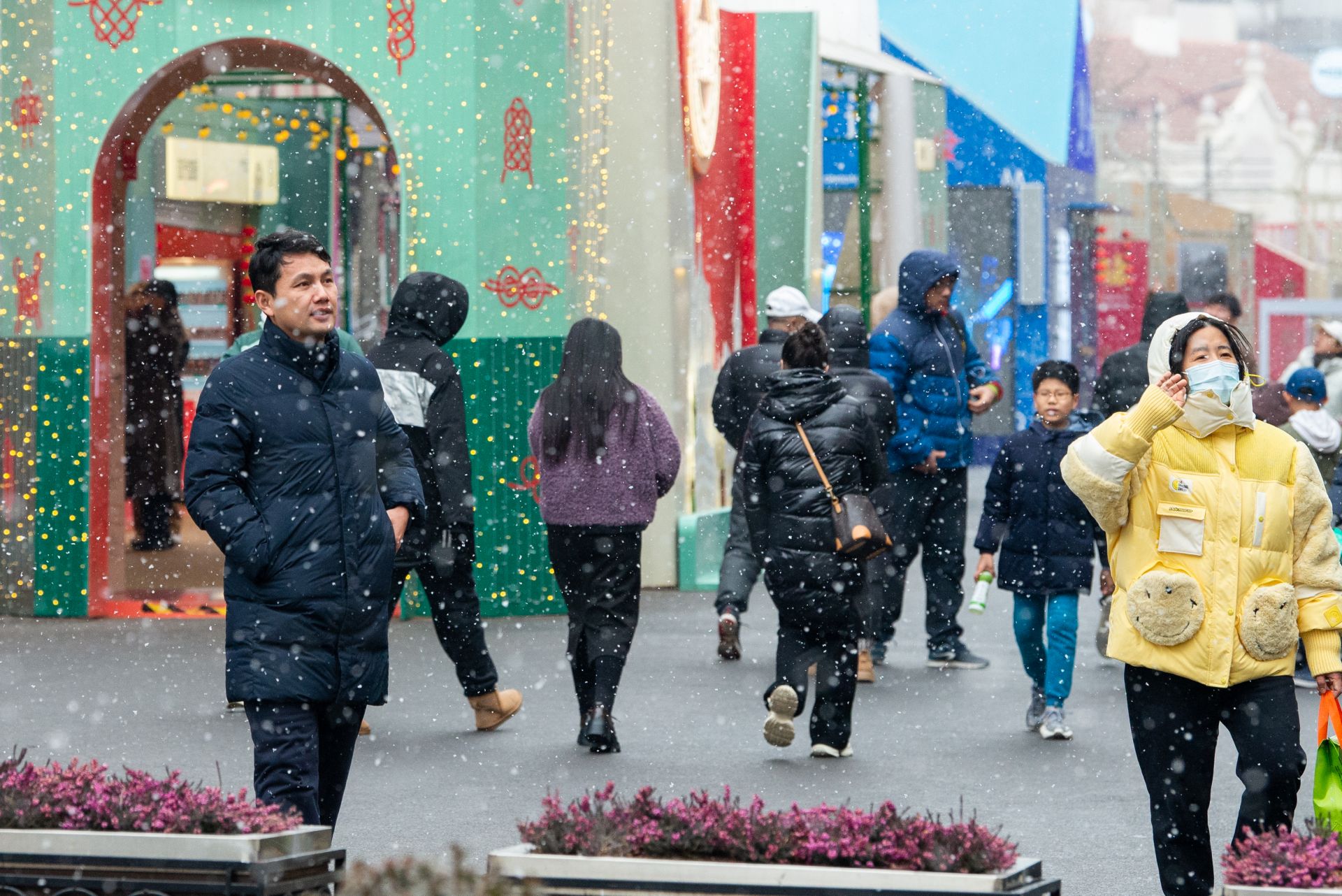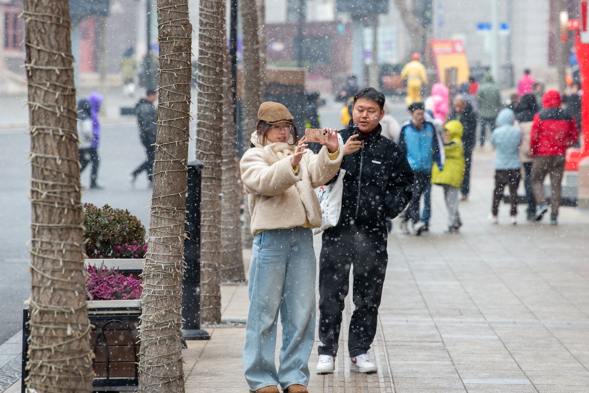 1月26日下午,青岛普降瑞雪。记者在中山路看到,虽然降雪落地即化,但仍给市民和游客带来不少惊喜,增添了年味。(青岛日报/观海新闻记者 于滈 文/图)
