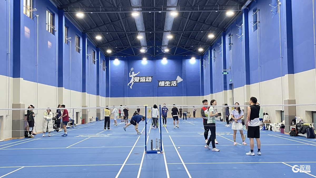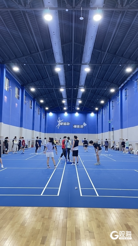走进羽毛球馆,入眼也是一片悦目的蓝色,六个场地紧密排布着,男女羽球爱好者正在挥汗如雨。戴路挑了挑眉,向记者“炫耀”着其中蕴含的设计细节。