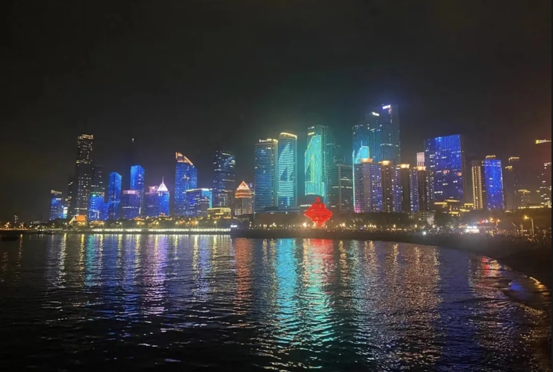 “以海为台、以天为幕、以城为景”,浮山湾畔流光溢彩,楼宇霓虹闪烁,为市民游客带来一场绚烂繁华的视觉盛宴。灯光变幻万千,以城市楼群为舞台,勾勒出岛城蜿蜒曲折的海岸线,灯光倾洒在海面上氛围感满满!