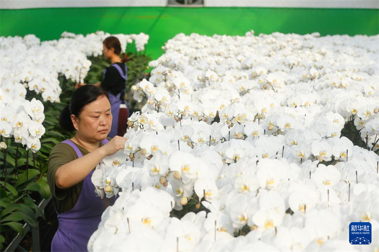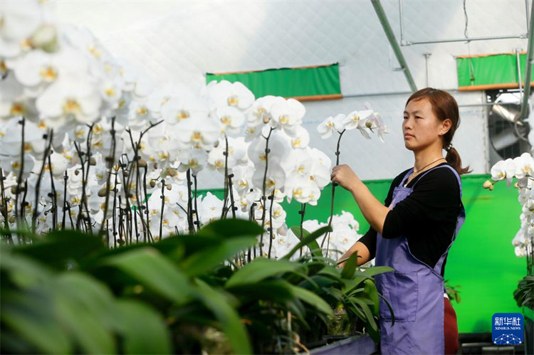 早春时节,在山东省平度市旧店镇万汇蝴蝶兰产业园,智能花卉温室里大片蝴蝶兰盛开,工人们忙着管护和加工鲜切花,供应国内外市场。近年来,平度市旧店镇大力发展蝴蝶兰种植,打造集组培育苗、现代化种植、研学及观光于一体的智慧农业产业园区,年产鲜切花300余万枝。花卉产业还带动当地200多人就业,促进农业增收,助力乡村振兴。新华社发(梁孝鹏摄)