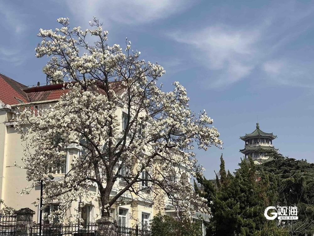 沿着金口一路漫步,时常能够从贯通的大阶梯上望见海天一色的景观,早已做好攻略的年轻人,正在这里记录春日的美好。阶梯上的漫画,更成为画面灵动的点缀。一直向前走,待小鱼山的览潮阁出现在眼前,社交媒体上刷屏的玉兰树也便出现了。玉兰与海的景观,让大家口口相传。