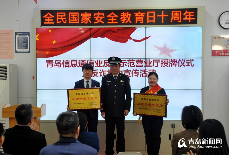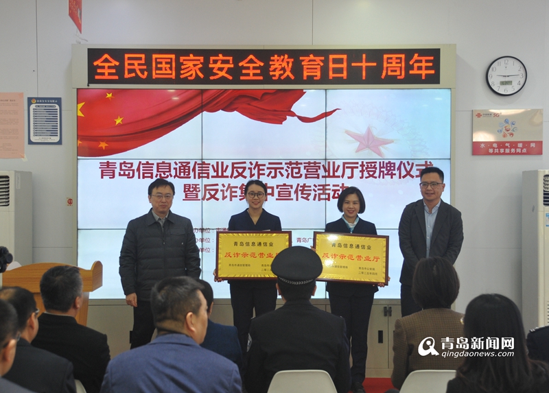 活动现场,青岛市通信管理局、青岛市公安局、青岛市委网信办、青岛市国安局、青岛市人民检察院、青岛联通、青岛移动、青岛电信、青岛广电、青岛新闻网等单位的相关负责同志出席,共同见证青岛市首批“反诈示范营业厅”揭牌,并同步启动反诈集中宣传活动。