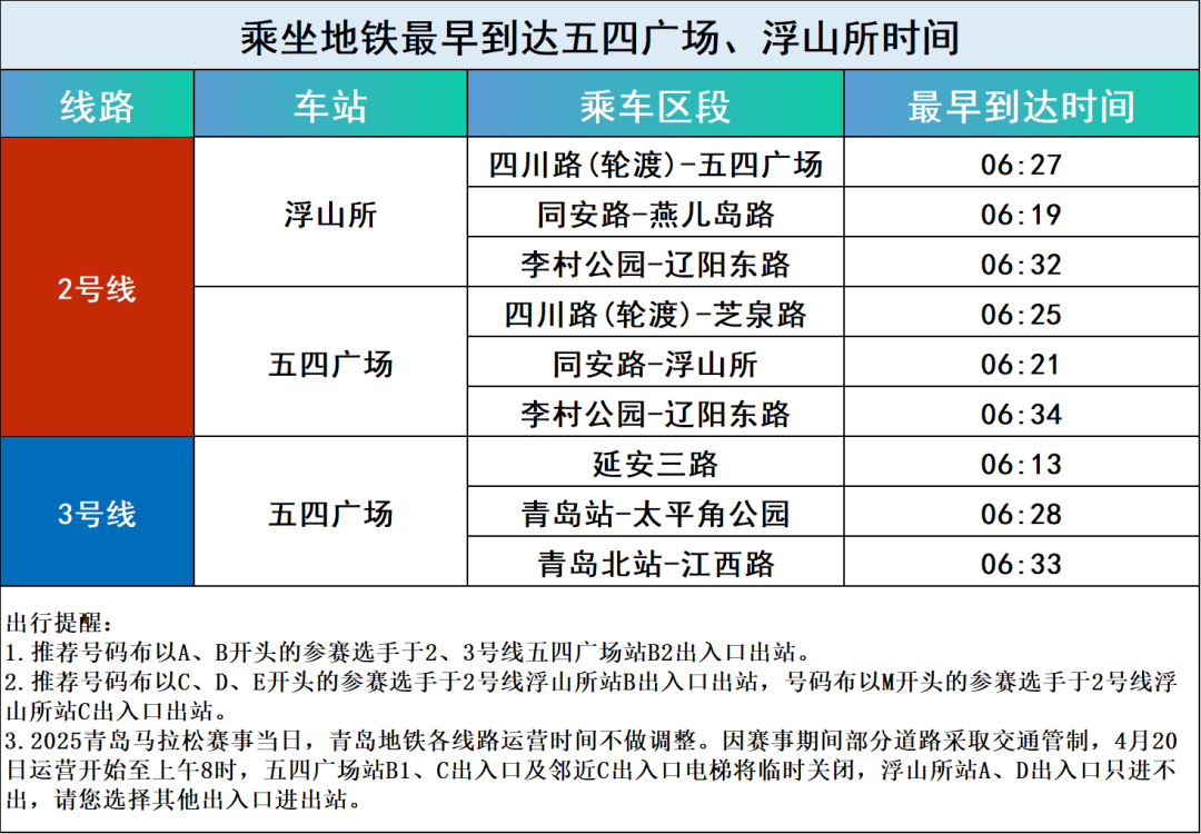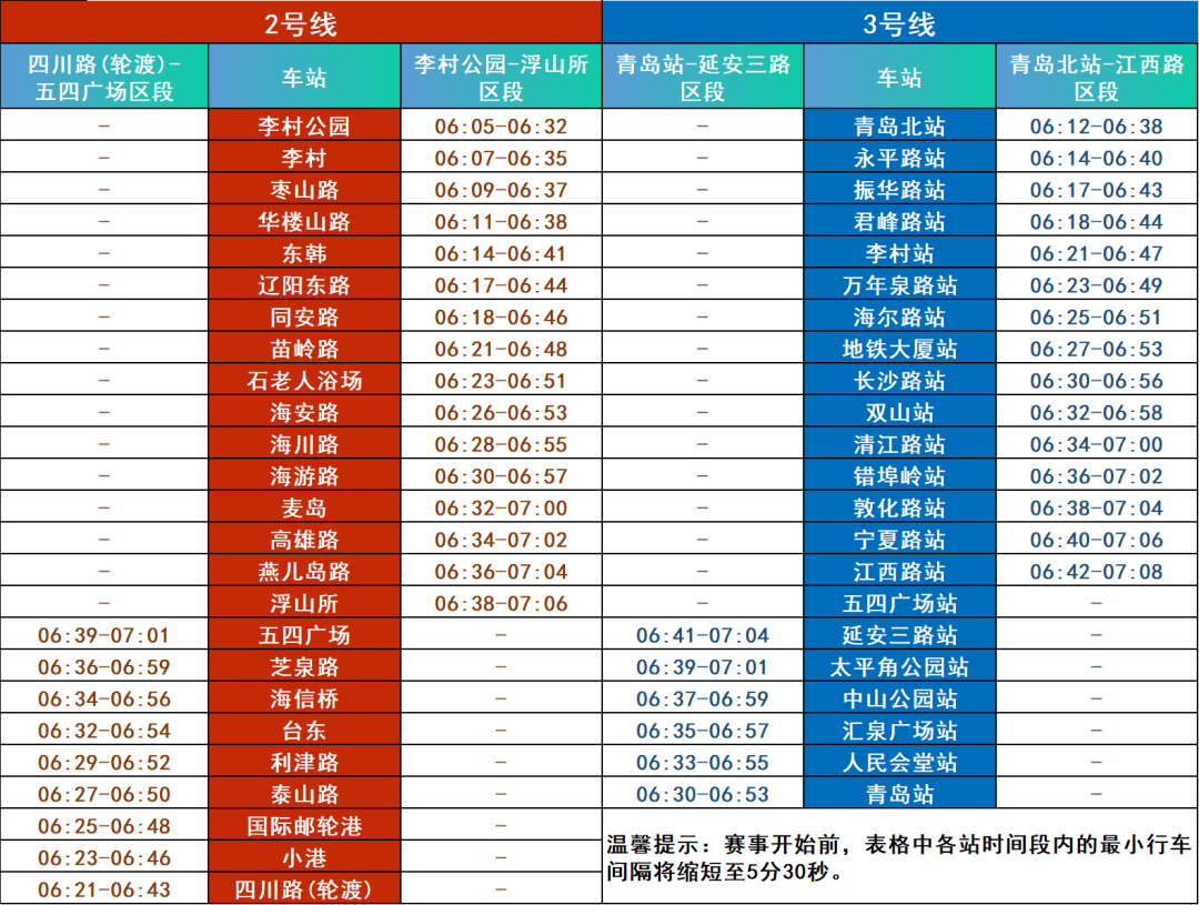 赛事当日,青岛地铁各线路运营时间不做调整,最早到达起点邻近车站(五四广场站、浮山所站)时间见下表。您可提前通过青岛地铁APP查询各站首车时间信息,便于规划行程。