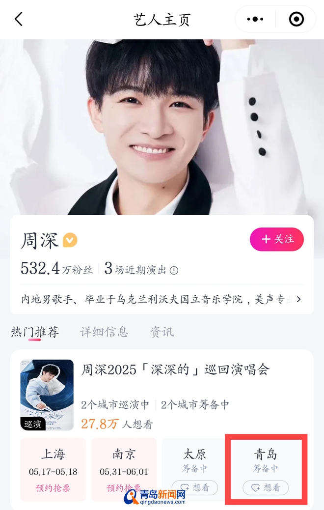 此次周深2025“深深的”巡回演唱会选择青岛作为其中一站,无疑是对青岛城市魅力和文化氛围的认可。此前,周深“9.29Hz”世界巡回演唱会已取得巨大成功。从2024年5月18日自上海启程,到2025年2月延伸至海外城市,足迹遍布国内外众多城市。在国内的深圳、成都、贵阳、武汉、南京、杭州、沈阳、北京、重庆、苏州、南昌、南宁等地的演出,场场爆满,创造了极高的人气和话题度。