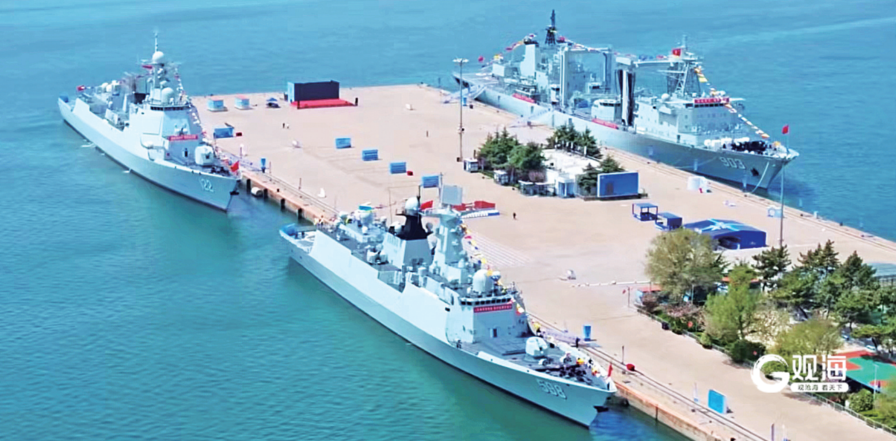 4月的青岛,彩旗在街道飘扬,机场、火车站、地铁、公交等公共场所滚动播放宣传片,整个城市张灯结彩,迎接人民海军成立76周年纪念日的到来。