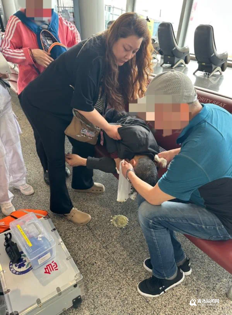 当天,钱金与丈夫刚结束湖南张家界的休假,准备搭乘CZ3937航班返回青岛。临近登机时,人群中突然传来“咚”的一声闷响,随即便是一片惊呼:“有人晕倒了!救命啊!”钱金闻声立即扔下行李,迅速冲到患者身边。只见一位大叔面色苍白、意识丧失瘫倒在座位上,家属惊慌失措。她沉着冷静地指导众人疏散,保持通风,随即跪地检查患者生命体征:开放气道、判断呼吸和脉搏、查看瞳孔反射……同时,优先怀疑患者是否低血糖,但由于现场没有血糖仪,钱金只得先采取其他急救措施。“当时只有一个念头,必须争分夺秒防止误吸和窒息。”钱金事后回忆道。