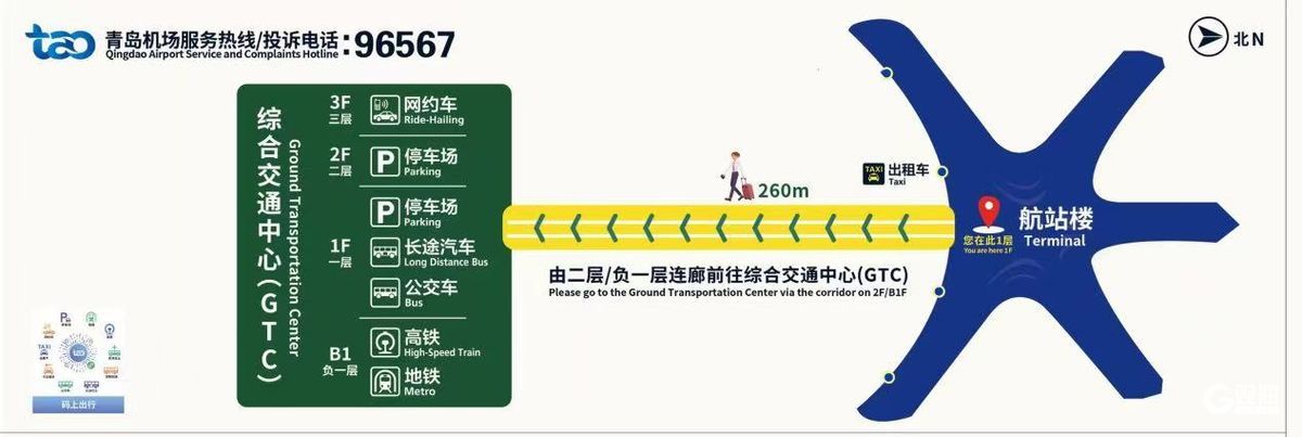 特殊旅客无障碍通行服务:青岛机场为残疾人等特殊旅客提供无障碍出行环境,GTC停车楼、平价停车场内设置了充足的爱心车位。其中GTC停车楼设有爱心车位82处,位于P1-P9停车区近航站楼侧,有需要的旅客可通过拨打0532-96567预约。