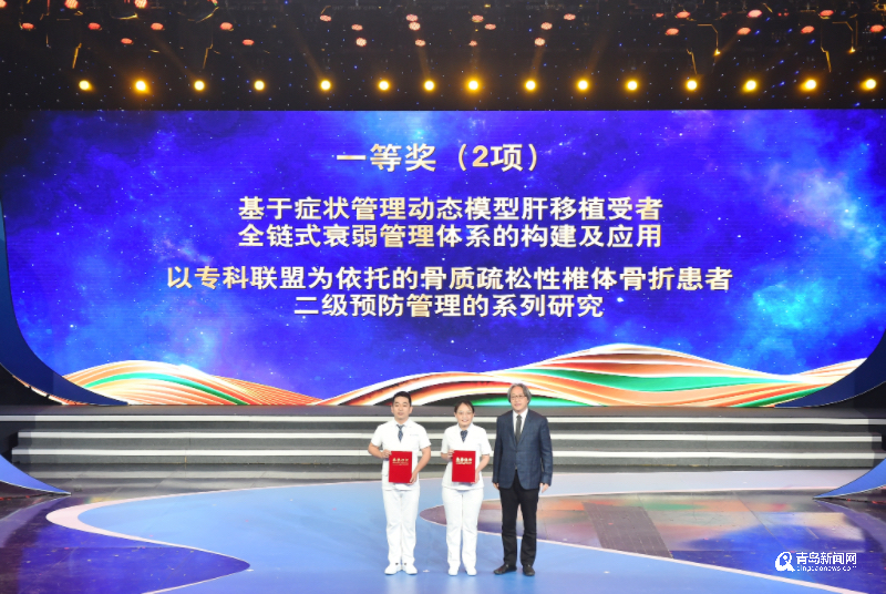 青岛市妇女联合会党组成员、副主席温海英,青岛市科学技术协会党组成员、副主席刘红英为“青岛护理科技奖”二等奖代表颁奖