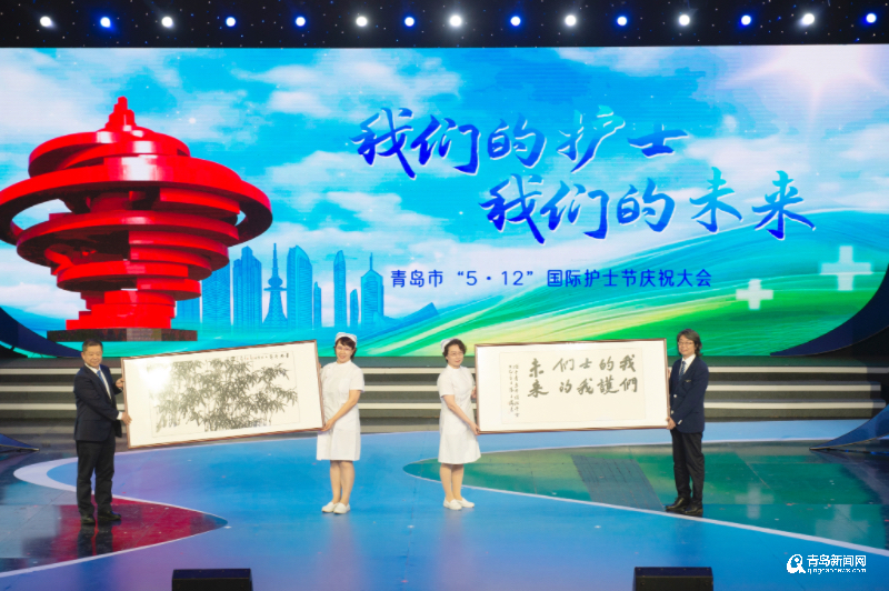 庆祝大会上,主题宣传片《护士的十二时辰》、歌舞《你是我的天使》展现了新时代护理工作者专业、奉献、坚韧的职业风采;小品《护士吐槽大会》以幽默方式还原护士工作中的酸甜苦辣,笑中带泪;《来自一份“护二代”的深情告白》通过护士子女的视角,呈现了护士家庭背后的奉献与坚守,令观众动容。书画寄情致敬天使,青岛市文学艺术界联合会向全市护理工作者赠送了主题书画及摄影作品,艺术家们以笔墨和镜头记录护士群体的大爱瞬间,为节日增添了人文温度。大会在合唱《心同此愿》的歌声中落下帷幕。