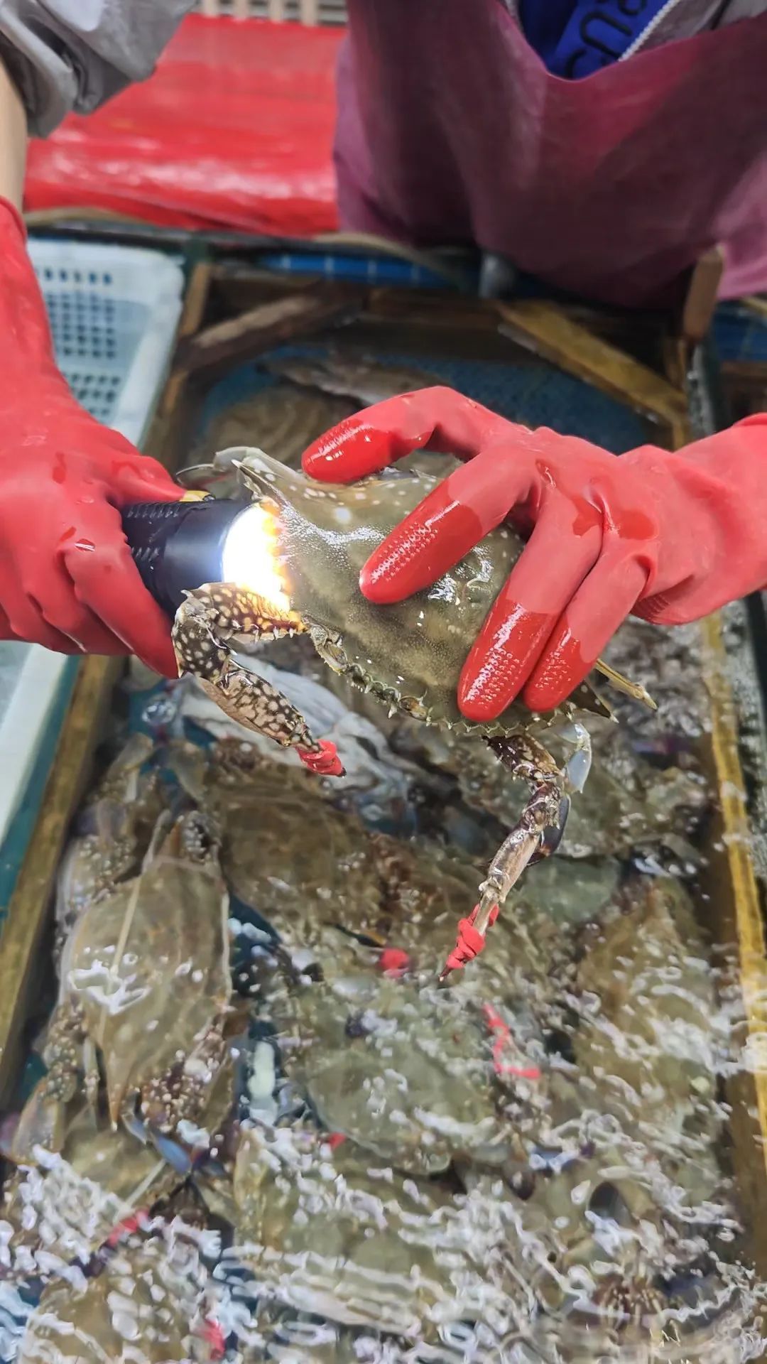 摊主用手电筒展示满黄梭子蟹。