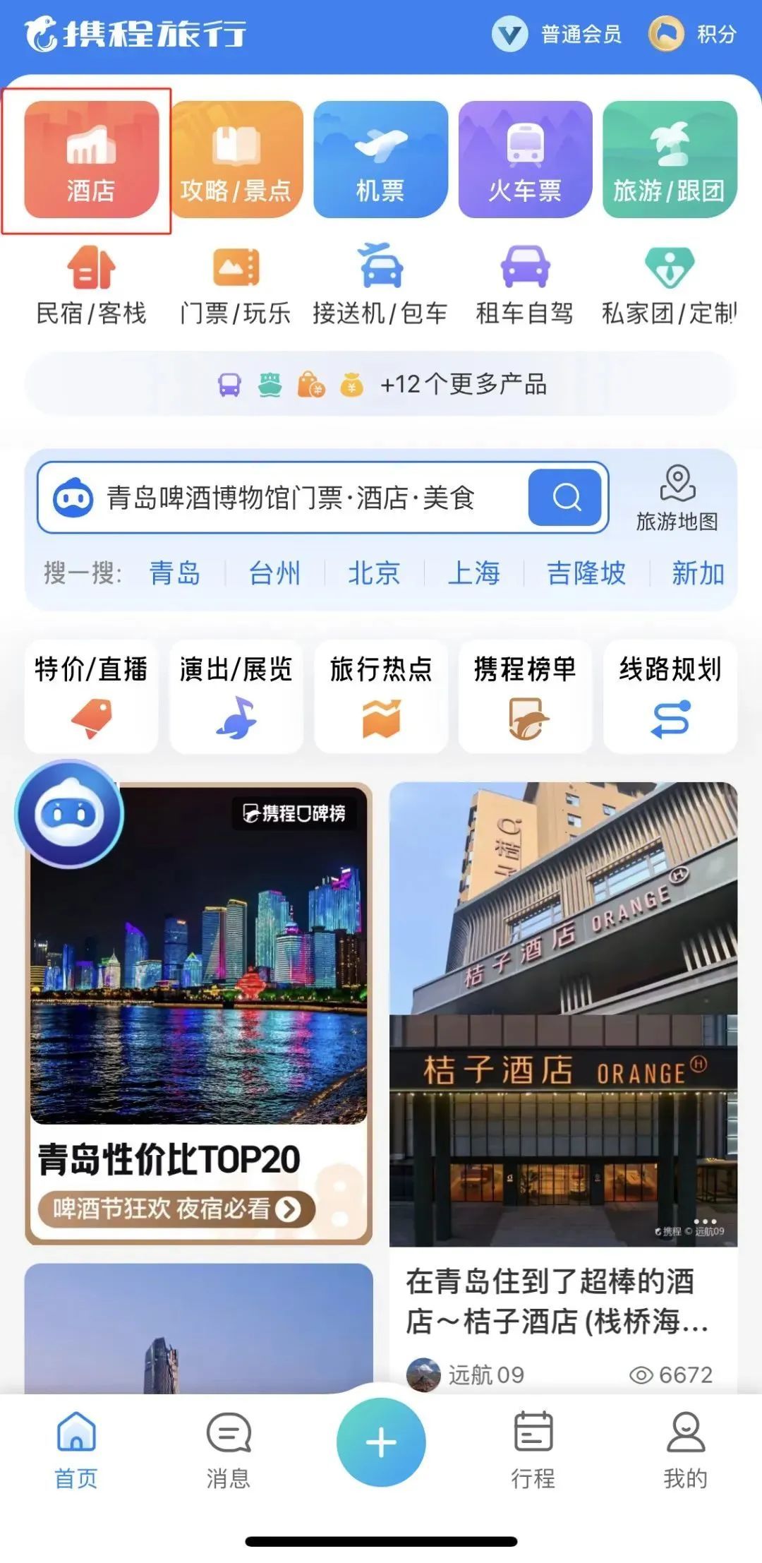 活动期间,打开携程旅行、去哪儿旅行APP,首页点击进入“酒店”频道;