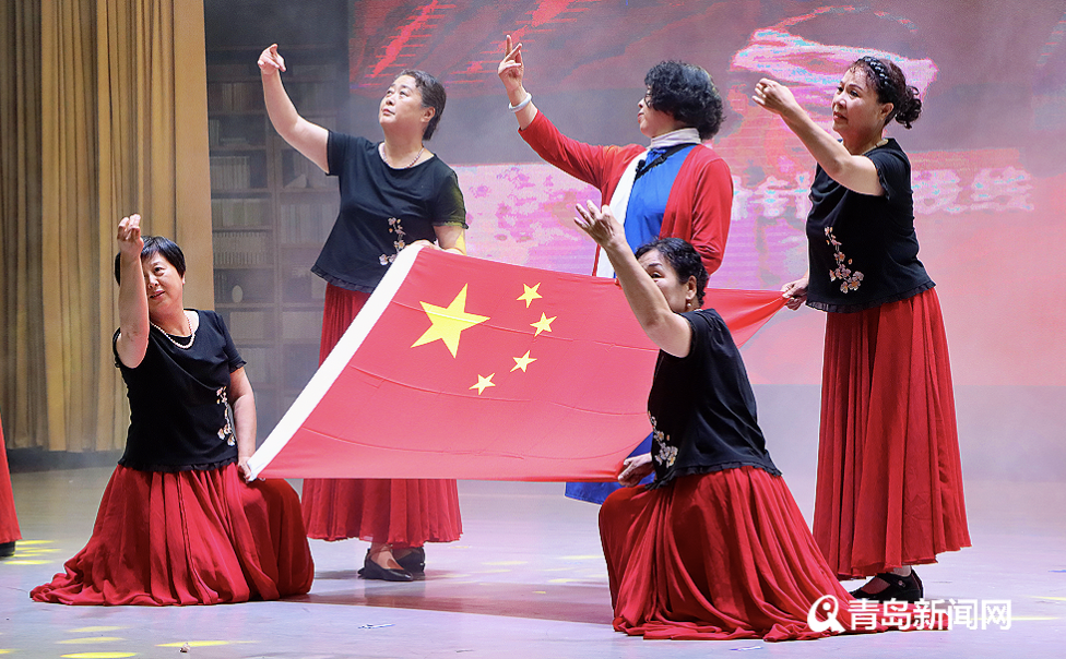 “七月的星光照亮长夜的路,七月的彩霞点燃心中的火。” 随着四位主持人慷慨激昂的开场,文艺汇演在崂山区金贝艺术团《秦汉古风双面燕洵》的鼓舞表演中拉开帷幕。鼓点铿锵有力,兼具非洲鼓的热烈与中国鼓的厚重,瞬间点燃全场氛围。