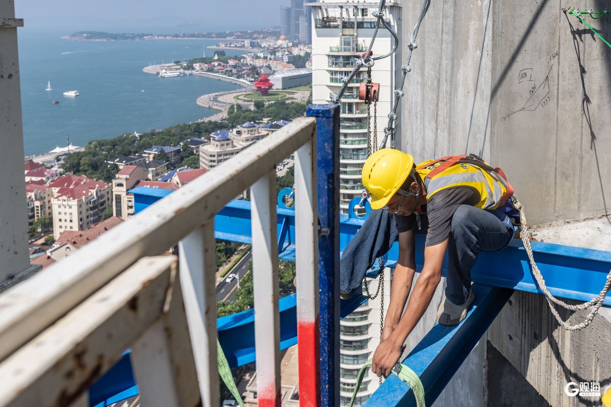 青岛日报社/观海新闻7月17日讯 7月17日,观海新闻记者探访了位于南京路1号的青岛航运贸易金融总部大厦项目。目前,该项目已正式进入百米以上高层主体施工阶段。现场,施工人员正忙碌作业。目前,项目已进入27 - 54层住宅部分主体结构施工阶段,同时,外幕墙以及会所转换层、一层大堂的精装修施工也同步展开。项目建成后,将成为青岛沿海一线又一超高层地标性建筑。