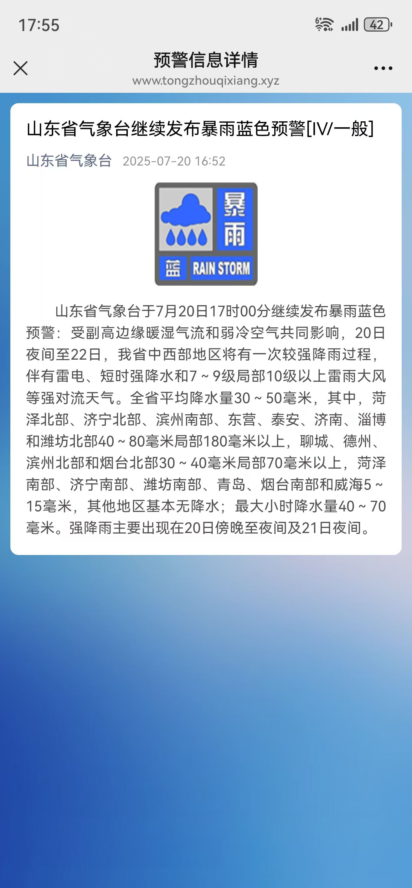山东省气象台于7月20日17时00分继续发布暴雨蓝色预警:受副高边缘暖湿气流和弱冷空气共同影响,20日夜间至22日,我省中西部地区将有一次较强降雨过程,伴有雷电、短时强降水和7~9级局部10级以上雷雨大风等强对流天气。全省平均降水量30~50毫米,其中,菏泽北部、济宁北部、滨州南部、东营、泰安、济南、淄博和潍坊北部40~80毫米局部180毫米以上,聊城、德州、滨州北部和烟台北部30~40毫米局部70毫米以上,菏泽南部、济宁南部、潍坊南部、青岛、烟台南部和威海5~15毫米,其他地区基本无降水;最大小时降水量40~70毫米。强降雨主要出现在20日傍晚至夜间及21日夜间。