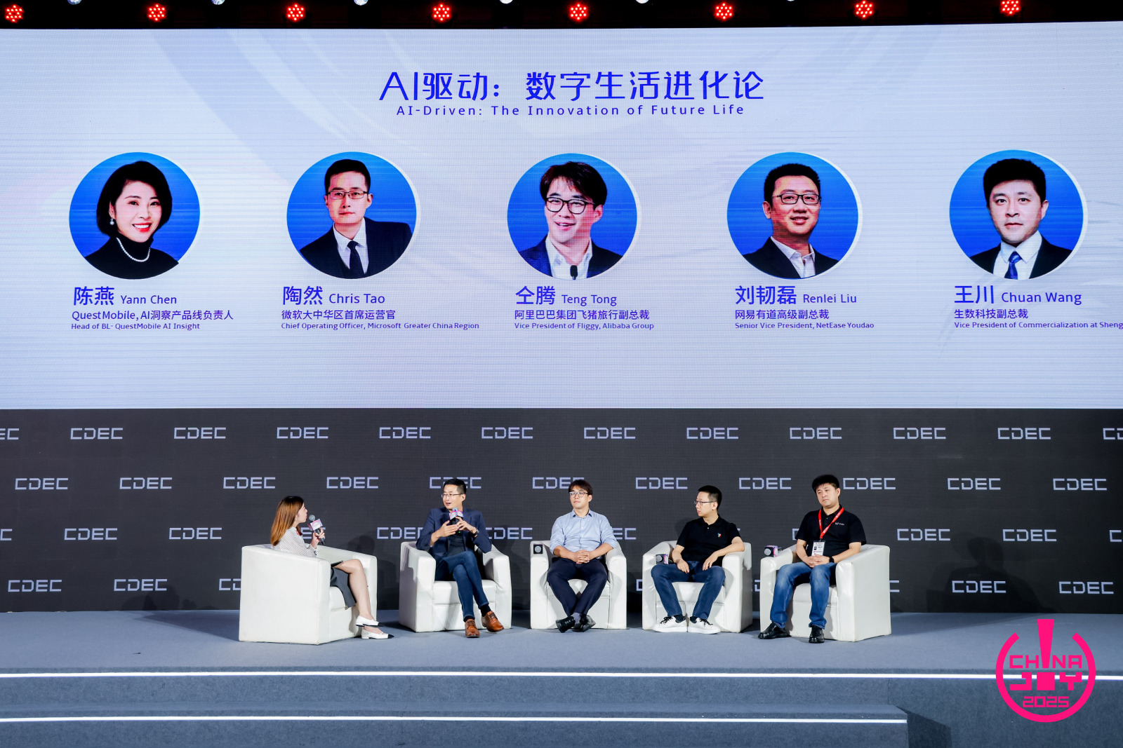 第一场座谈以“AI驱动:数字生活进化论”为主题,由QuestMobile AI洞察产品线负责人陈燕主持。在座谈中,各位嘉宾聚焦于AI在不同社会生活场景的应用进行了探讨。微软大中华区首席运营官陶然聚焦于AI在办公场景的应用,指出办公智能体(Agents)的开发并不只是让员工提效,而是旨在把整个企业的生产力、流程、系统打通和自动化。在这方面,微软的定位是搭建安全、合规、高效的企业级智能体平台,扶持所有的合作伙伴共建开放的智能体网络生态。阿里巴巴集团飞猪旅行副总裁仝腾聚焦于AI在文旅产业上的应用,指出AI使得文旅行业满足用户高度个性化需求的潜力被大大激发。仝腾以飞猪”问一问”AI旅行助手的产品逻辑为例,讲解了如何构建既能满足高度个性化需求又能保证信息可靠度的专业智能体。网易有道高级副总裁刘韧磊聚焦于AI在教育上的落地实践,提出大模型使得真正的因材施教成为可能。刘韧磊以有道推出的虚拟人口语教练Hi Echo、以及近期推出的全新硬件品类AI答疑笔为例,讲解了AI教育产品如何为用户提供个性化的学习方案,带来如真人老师般的教学体验。生数科技商业化副总裁王川重点介绍了多模态视频生成模型在游戏和社交领域的应用价值。他强调,交互是人类的基本需求,相比被动的内容消费(如阅读和观看),可交互的视觉内容(如图像、视频和虚拟角色)更能满足用户的深层次需求。这正是生数科技专注研发多模态视频生成模型满足用户诉求的核心依据之一。