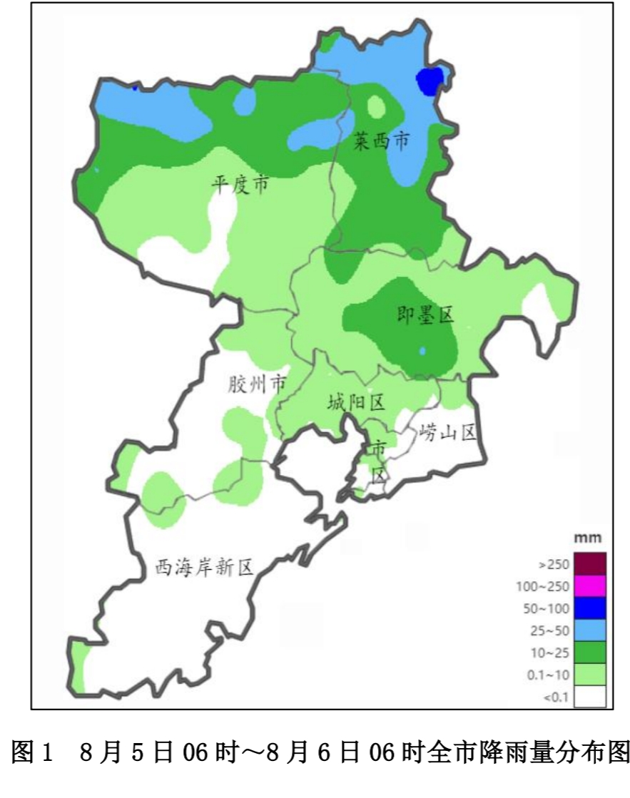 8月5日06时至6日06时,全市平均降水量9.0毫米,各区市平均降水量分别为:莱西24.5毫米,平度14.4毫米,即墨8.7毫米,城阳1.6毫米,市区0.2毫米,胶州0.2毫米,崂山0.1毫米,西海岸微量。