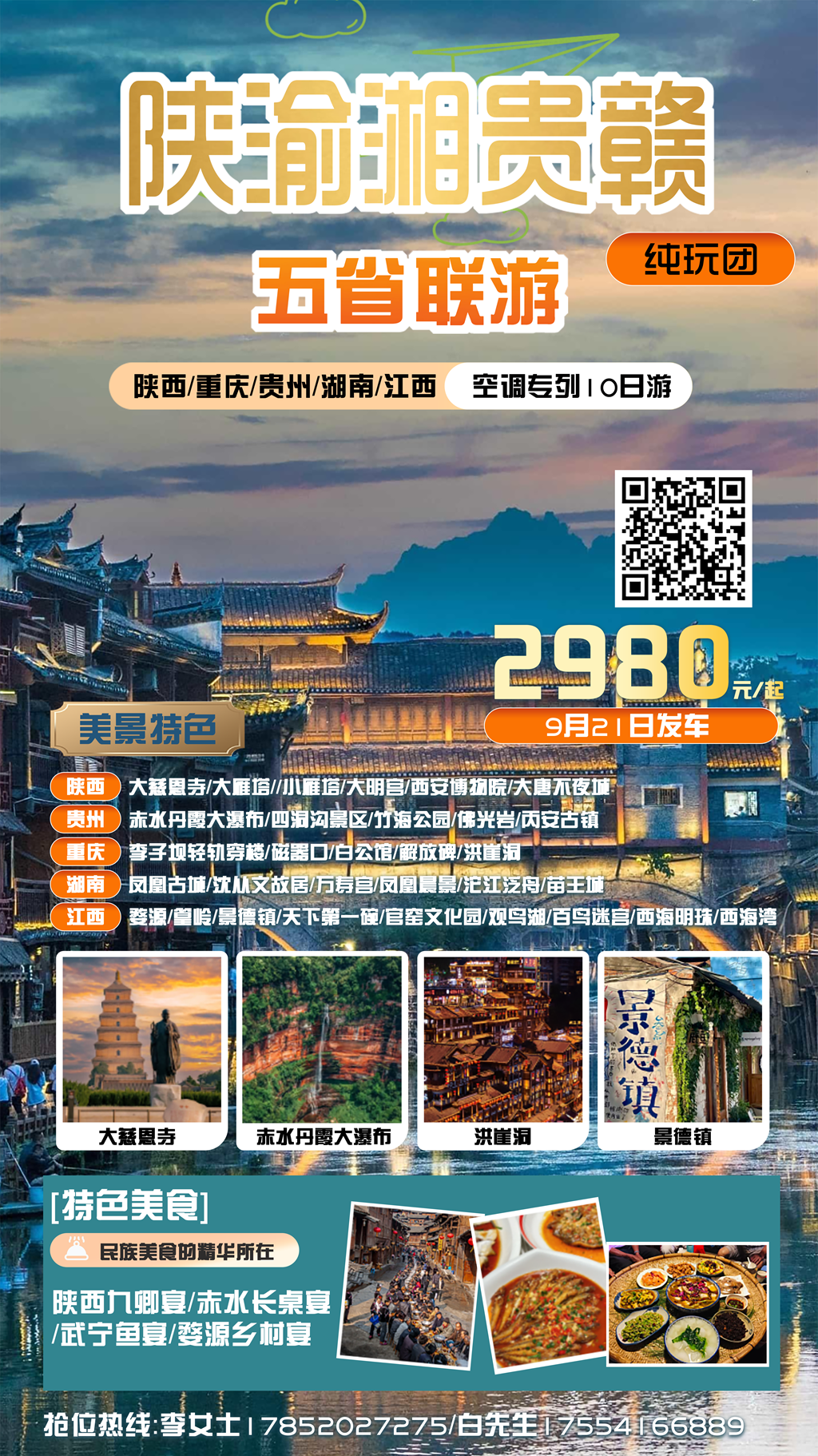据了解,本次专列以“一线连五省”为亮点,将西部壮美与江南柔情尽收眼底。从古都西安的大雁塔、大明宫遗址,到重庆李子坝轻轨穿楼、洪崖洞灯火;从贵州赤水丹霞瀑布的磅礴气势,到湖南凤凰古城沱江泛舟的诗意栖居,再到江西婺源篁岭晒秋的斑斓画卷,行程设计兼顾自然风光与人文底蕴,真正实现“车随景走、人在画中游”。
