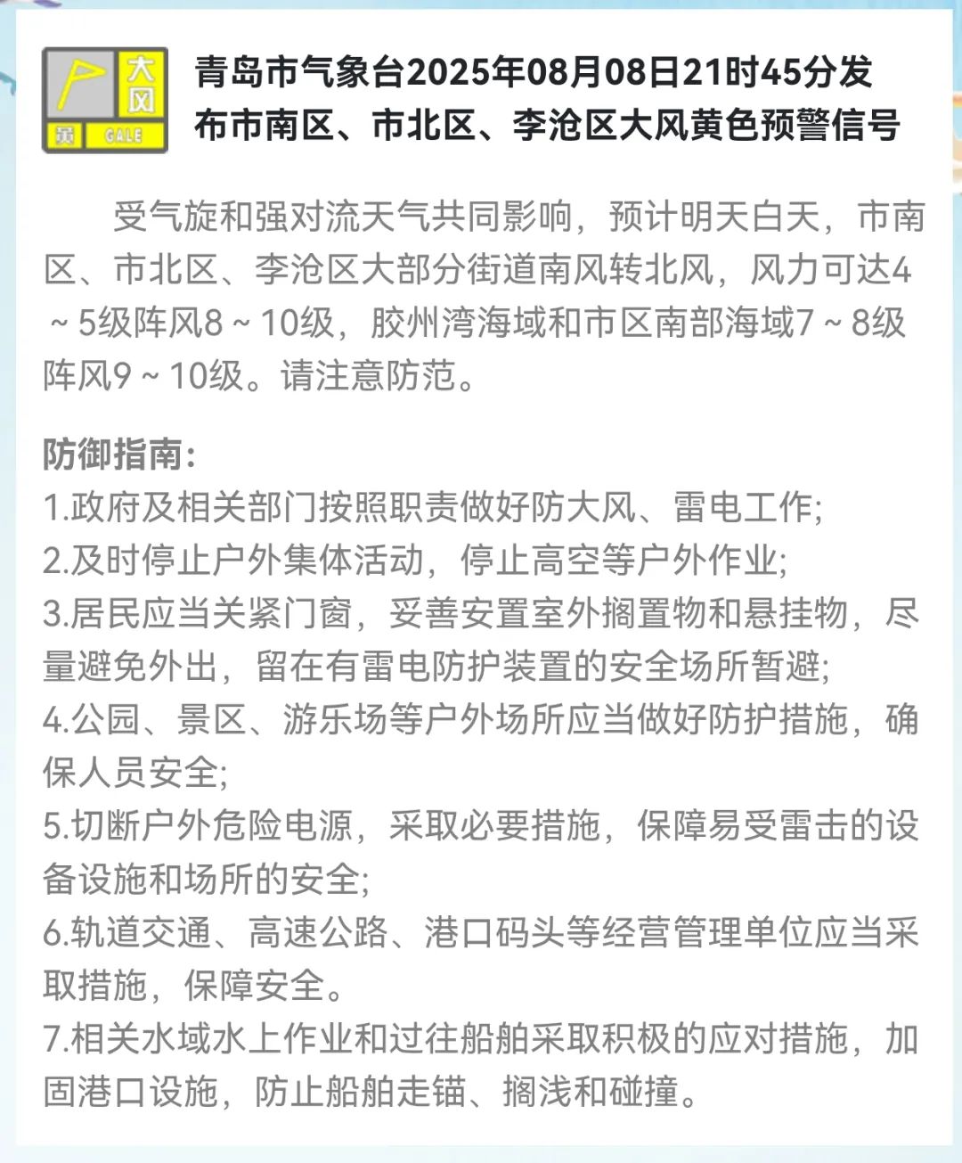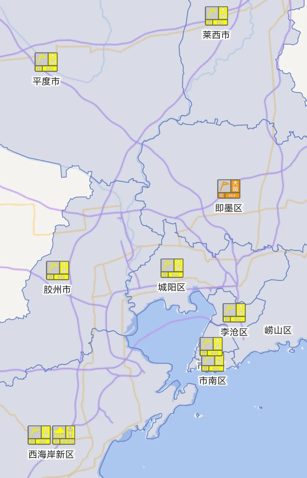 目前,青岛市气象台大风橙色预警信号、暴雨黄色预警信号,即墨大风橙色预警信号,市内三区、西海岸新区、城阳、胶州、平度、莱西大风黄色预警信号,西海岸新区、胶州、平度莱西暴雨黄色预警信号,均在生效中!