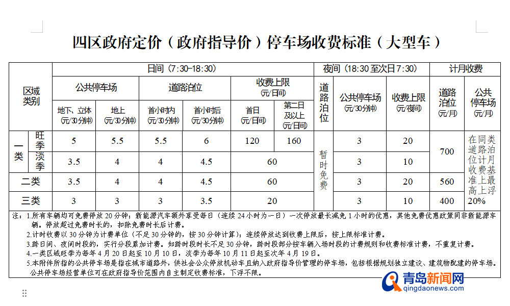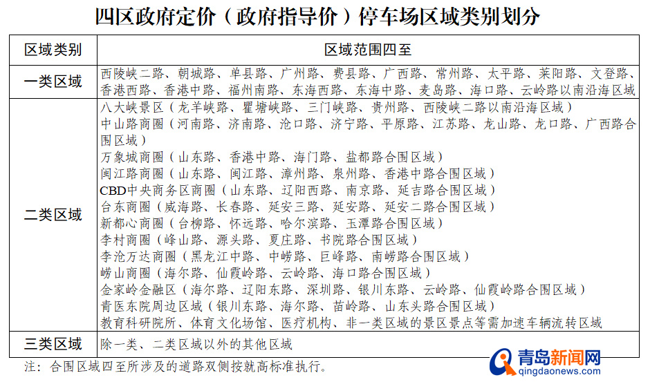根据征求意见稿,四区(市南区、市北区、李沧区、崂山区)经营性公共停车场将根据动静态交通情况、停车供需状况和区域功能定位,划分为一、二、三类区域实行差异化收费。