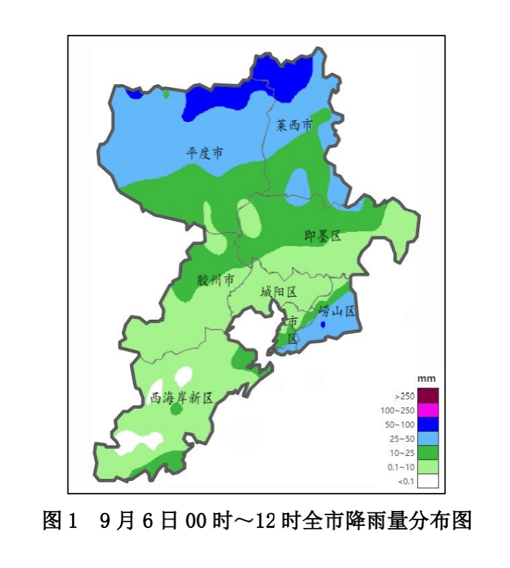 9月6日00时至12时,全市平均降水量20.6毫米,各区市平均降水量分别为:莱西39.5毫米,平度36.1毫米,崂山33.8毫米,市区16.8毫米,即墨10.4毫米,胶州6.5毫米,西海岸4.4毫米,城阳3.1毫米。降水量50~100毫米的20个站,25~50毫米的67个站,排在前3位的是:莱西上店站89.5毫米、莱西河里吴家站69.0毫米和莱西姚沟站68.0毫米。小时降水量最大为莱西上店站53.0毫米(出现在9月6日03时~04时)。