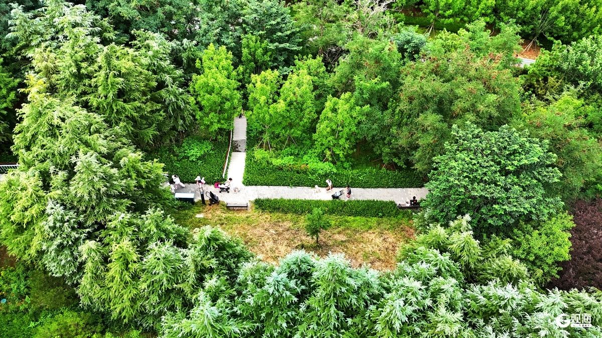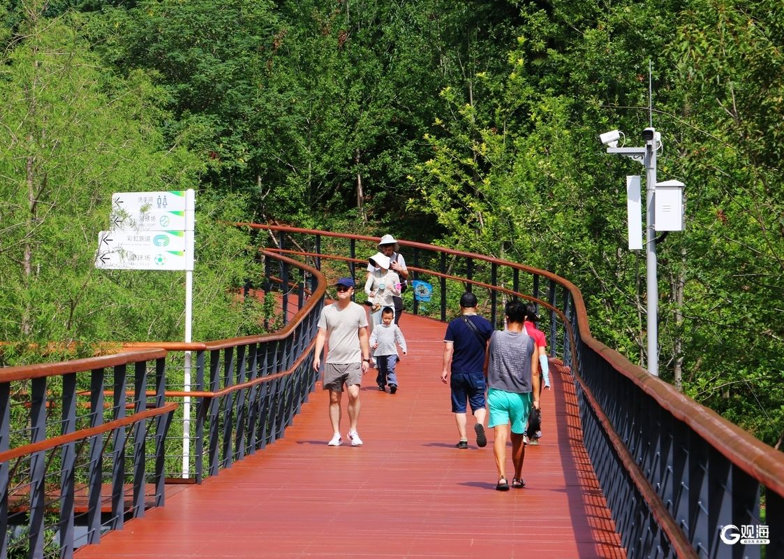 蜿蜒的木栈道依山而建,行人缓步而上,脚下木板轻响,抬头便是层叠绿荫;绿道上,有人骑着单车穿梭,衣角被风掀起,笑声落满林间;草坪空地上,孩子们嬉闹奔跑,几顶帐篷搭在其间,亲朋好友们闲谈畅聊;不远处游乐场里,满是孩子的雀跃呼喊,家长们坐在长椅上,笑着看孩子撒欢。
