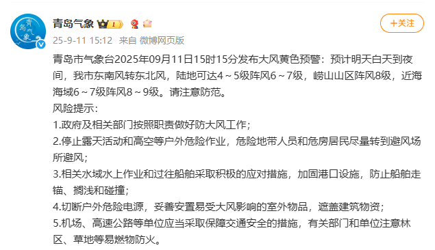 青岛市气象台2025年09月11日15时15分发布大风黄色预警:
