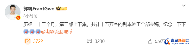 9月12日凌晨,导演郭帆在社交平台宣布,经过23个月的精心打磨,《流浪地球3》的剧本已经完稿,该剧本分为上下两集,总字数达到十五万字。郭帆还透露,尽管剧本已经完成,但仍可能进行小范围的修改,目前上集剧本已经修改到第十二版,下集则修改到第十四版。