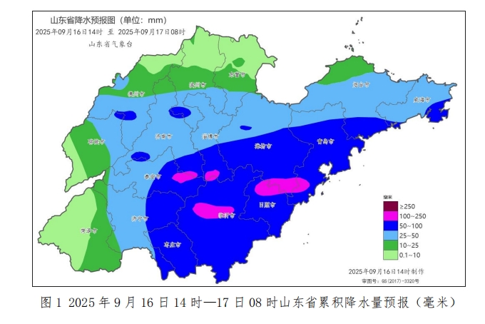 预计16日下午到夜间,我省大部地区仍有强降雨天气,伴有雷电、短时强降水、7~9级局部10级雷雨大风和局地冰雹。全省累积平均降水量30~50毫米,其中,德州南部、济南、泰安、淄博、潍坊、济宁、枣庄、临沂、日照、青岛、烟台和威海有大雨到暴雨局部大暴雨(40~70毫米局部100~200毫米,单点最大可达220毫米以上),其他地区有小到中雨局部暴雨(5~15毫米局部50毫米以上)。最大小时降水量40~70毫米。