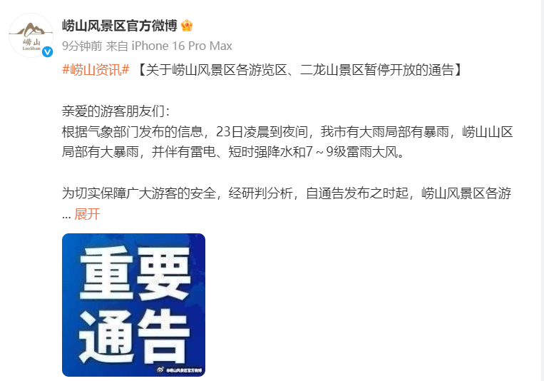 在此也提醒大家密切关注天气预报。由此引起的不便敬请谅解。如有咨询、求助等事项,请拨打咨询服务热线:0532-96616。更多信息请关注崂山风景区官方微博。