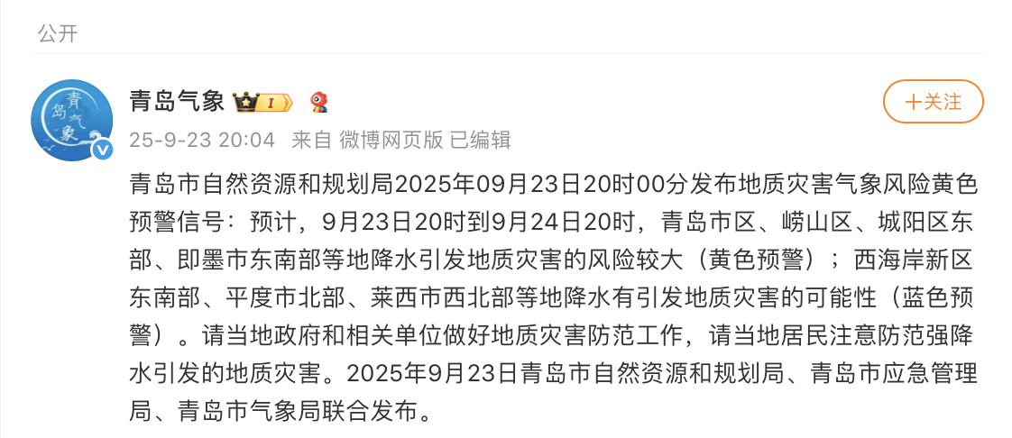 预计,9月23日20时到9月24日20时,青岛市区、崂山区、城阳区东部、即墨市东南部等地降水引发地质灾害的风险较大(黄色预警);西海岸新区东南部、平度市北部、莱西市西北部等地降水有引发地质灾害的可能性(蓝色预警)。请当地政府和相关单位做好地质灾害防范工作,请当地居民注意防范强降水引发的地质灾害。2025年9月23日青岛市自然资源和规划局、青岛市应急管理局、青岛市气象局联合发布。