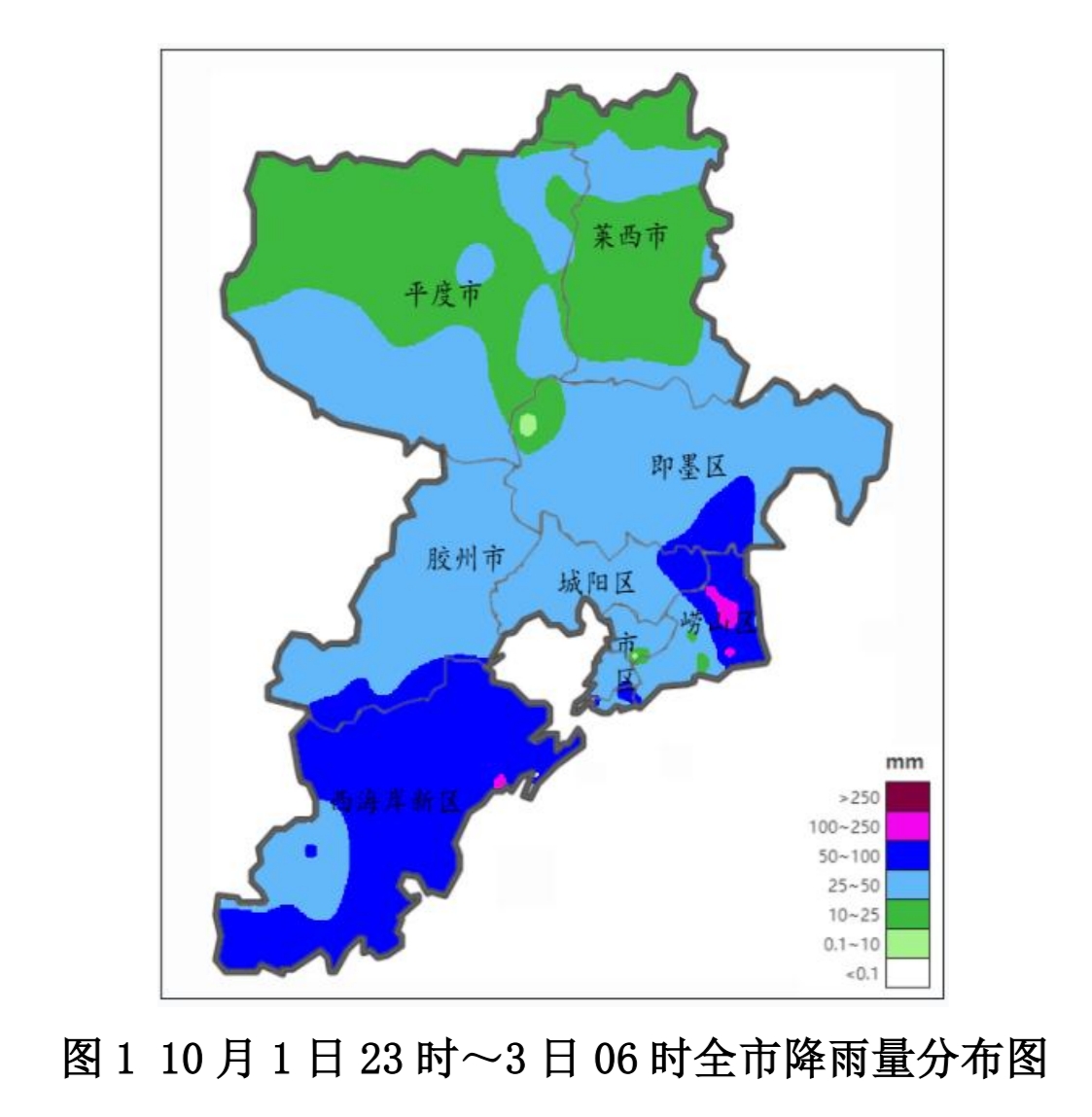 10月1日23时至3日06时,全市平均降水量38.9毫米,各区市平均降水量分别为:西海岸64.6毫米,崂山55.7毫米,城阳45.9毫米,胶州42.1毫米,市区40.4毫米,即墨39.8毫米,平度23.2毫米,莱西22.7毫米。