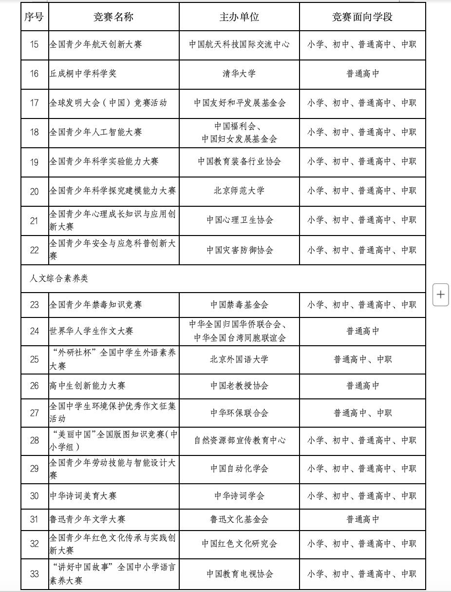 此前,经主办单位自主申报,专家评审、公示和复核等程序,确定全国青少年人工智能创新挑战赛等47项竞赛活动为2025—2028学年面向中小学生的全国性竞赛活动,举办时间原则上为2025年10月至2028年8月,在此期间每学年举办不得超过1次,累计不超过3次。竞赛以及竞赛产生的结果不得作为中小学招生入学的依据和高考加分项目,不得在高校招生中违规使用竞赛结果。