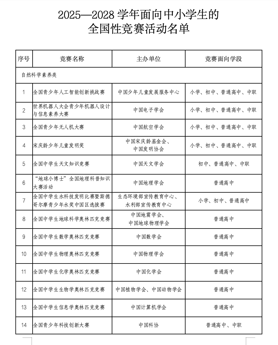 青岛日报社/观海新闻讯 10月29日,教育部办公厅公布了2025—2028学年面向中小学生的全国性竞赛活动名单,全国共有47项。
