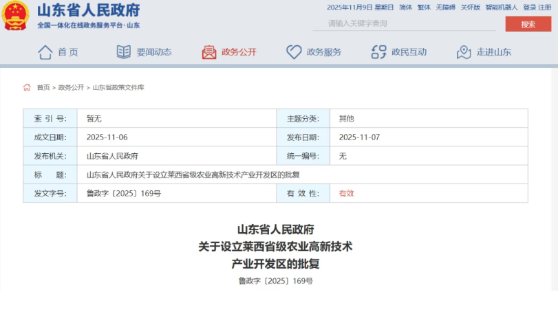 你市《关于申请设立莱西省级农业高新技术产业开发区的请示》(青政呈〔2024〕65号)收悉。现批复如下。