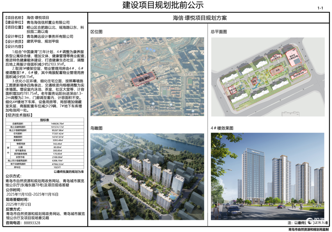 青岛日报社/观海新闻讯 日前,青岛市自然资源和规划局发布海信•璟悦项目规划方案批前公示。项目位于崂山区合肥路以北、瑶海路以东,科技园二路以南,由青岛海信信邦置业有限公司负责建设。