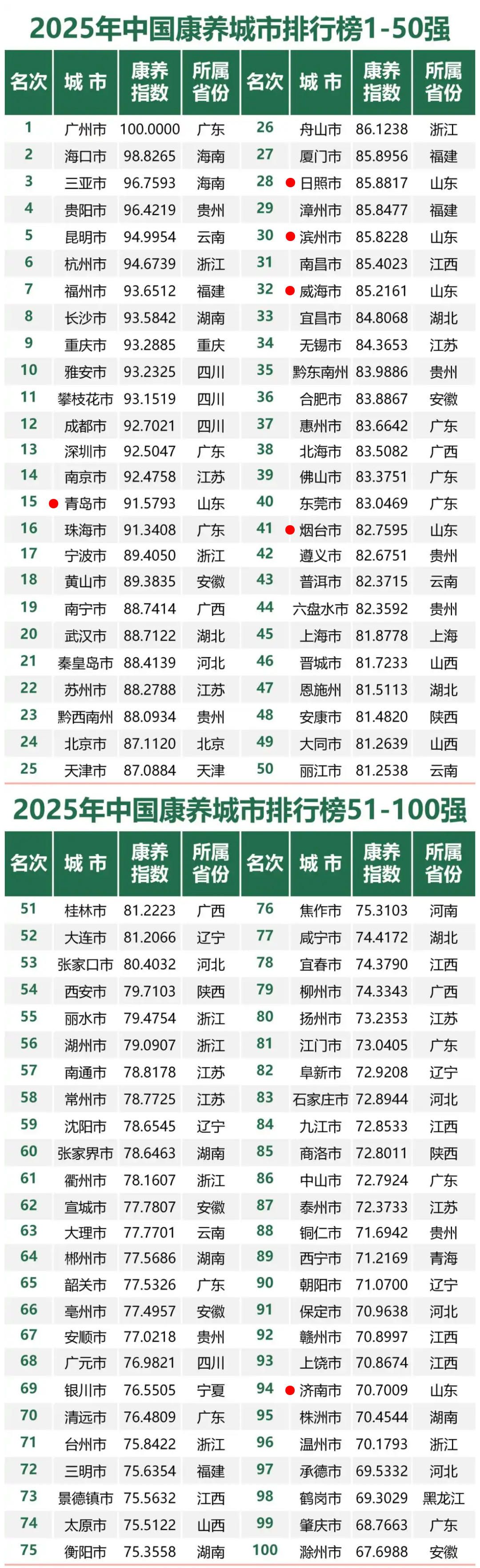 今年,山东共有6座城市上榜百强,分别是青岛、日照、滨州、威海、烟台、济南。去年,山东青岛、滨州、威海、烟台、济南5市入选百强。