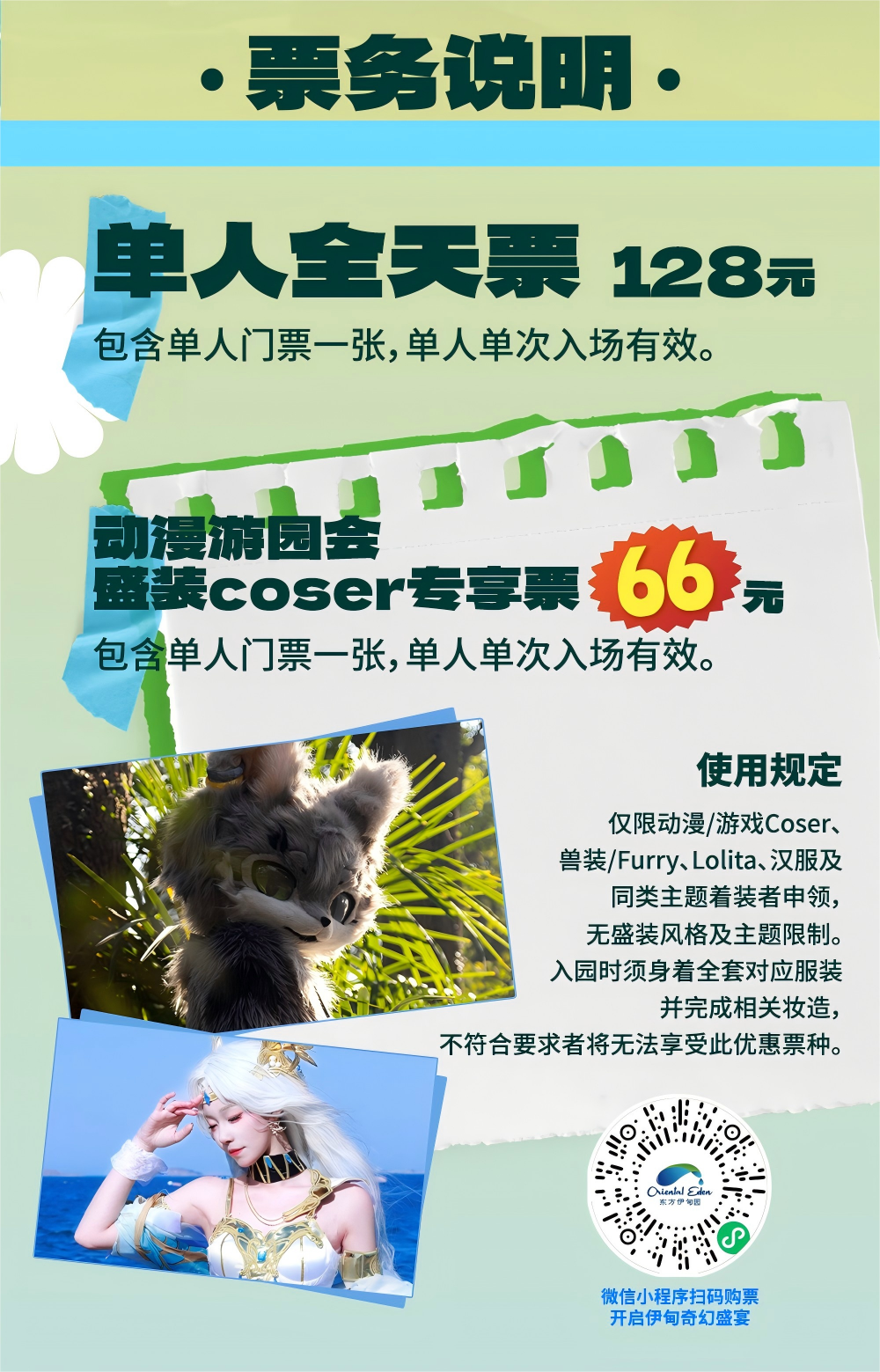 为鼓励大家展现多元文化魅力,活动特别推出“盛装优惠”政策。动漫/游戏Coser、Furry爱好者、Lolita风格追随者、汉服爱好者以及身着同类主题服装的游客,均可购买66元的专属优惠票(入园时需核验)。下个周末,不妨穿上心仪的装扮,走进东方伊甸园,成为这场奇幻之旅中最亮丽的风景线。