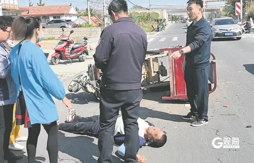 5月3日,海阳市徐家店镇台上村西口的乡村公路上,车流如织。上午9点多,一声刺耳的撞击声打破了路面的喧闹——一辆轿车与一辆三轮车不慎相撞,三轮车车主受伤倒地。