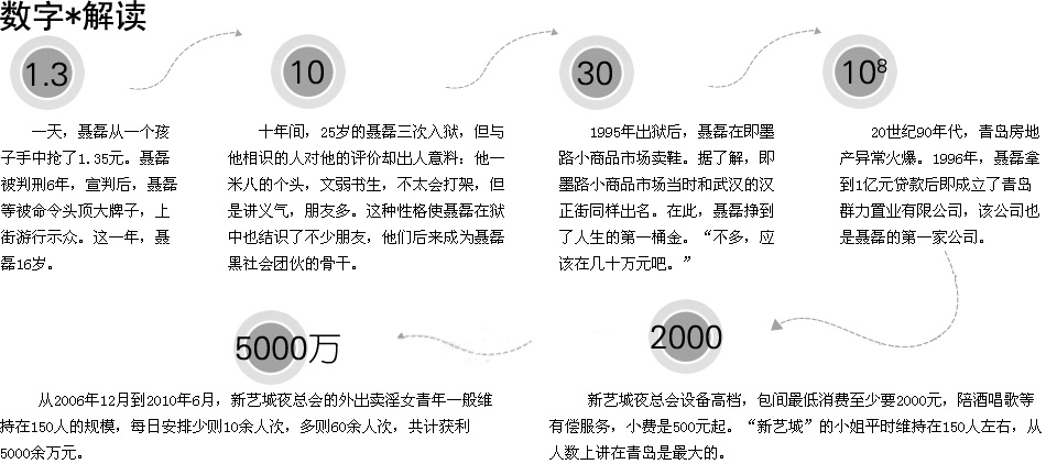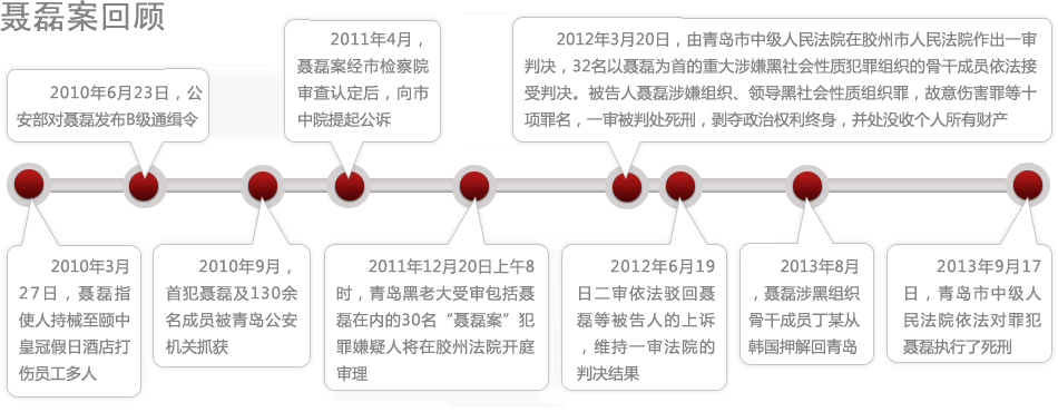 聂磊简介 曾用名张泷、王鑫,男,1967年7月17日出生于山东省青岛市,曾因犯抢劫罪被两次判刑,因斗殴被劳动教养。1998年以来,聂磊以狱友、邻居、亲属等关系,吸纳、招募部分社会闲散人员、劳改劳教人员、被开除公职人员进入开办的经济实体,逐步形成以聂磊为组织、领导者的上百人黑社会性质组织“聂磊公司”。 在聂磊统一组织、领导下,该组织开办夜总会组织妇女进行卖淫活动、开设地下赌场,攫取了巨额经济利益。同时,成立数十人的暴力犯罪团伙,大肆实施故意伤害、寻衅滋事等违法犯罪活动,称霸一方。在青岛市部分区域和行业内,形成非法控制和重大影响,严重破坏经济、社会生活秩序。 |