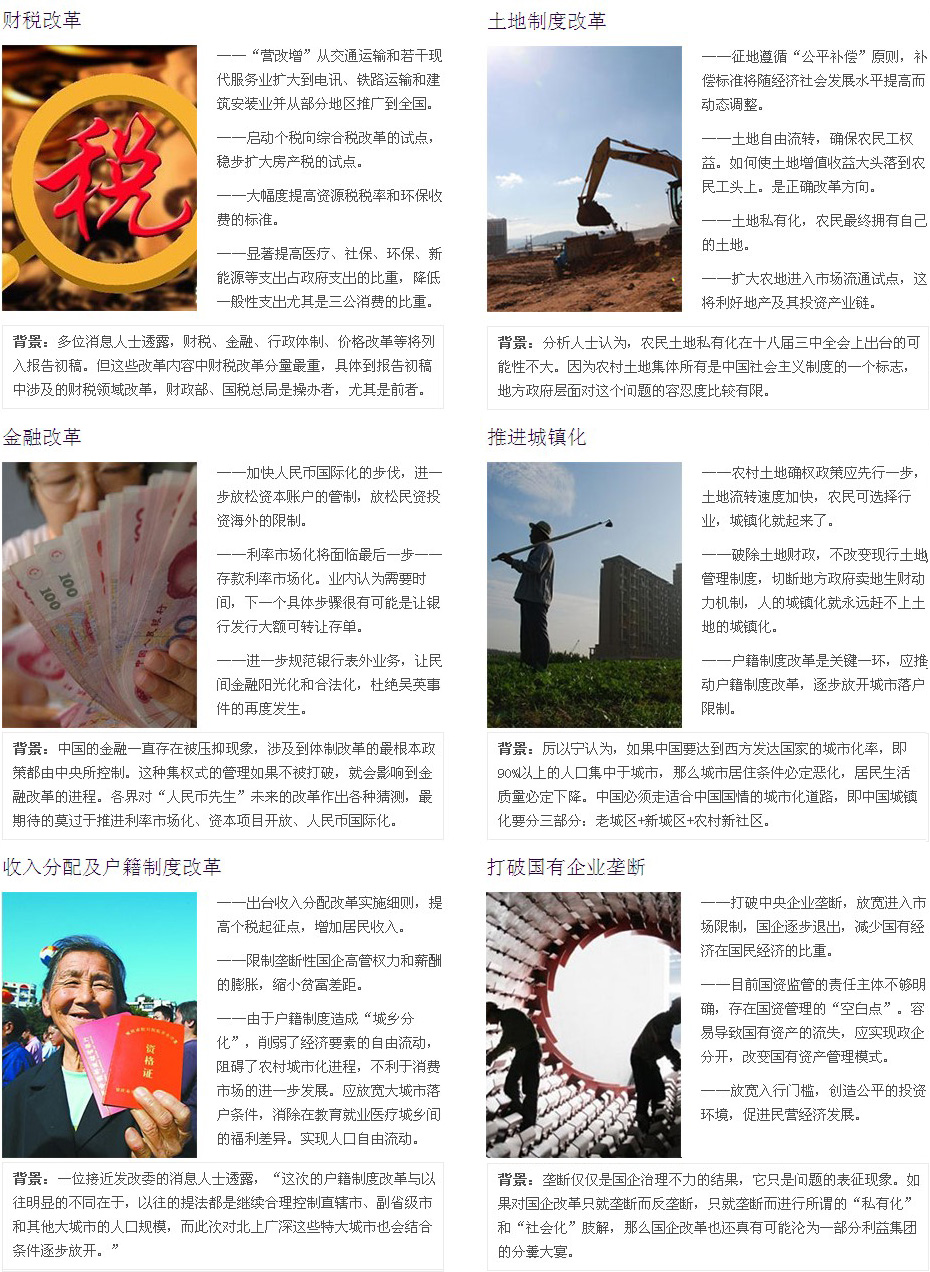 所谓“383”方案,是指包含“三位一体改革思路、八个重点改革领域、三个关联性改革组合”的中国新一轮改革路线图。 报告具体提出了涉及上述八大领域的三大改革突破口: 一是放开准入,引入外部投资者,加强竞争; 二是深化社会保障体制改革,设立“国民基础社会保障包”; 三是深化土地制度改革,集体土地入市交易。除了为改革制定“路线图”,报告还给出了改革的“时间表”,建议将改革分为三个阶段,即2013年至2014年的近期改革、2015年至2017年的中期改革和2018年至2020年的远期改革。...[详情]