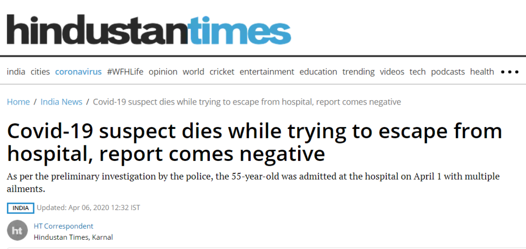 据《印度斯坦时报》6日报道,当地时间4月6日凌晨,印度哈里亚纳邦一名新冠肺炎疑似患者,试图用床单和衣服结绳从窗户逃走,结果从6楼坠亡。然而,该患者死后,他的检测结果却呈阴性。