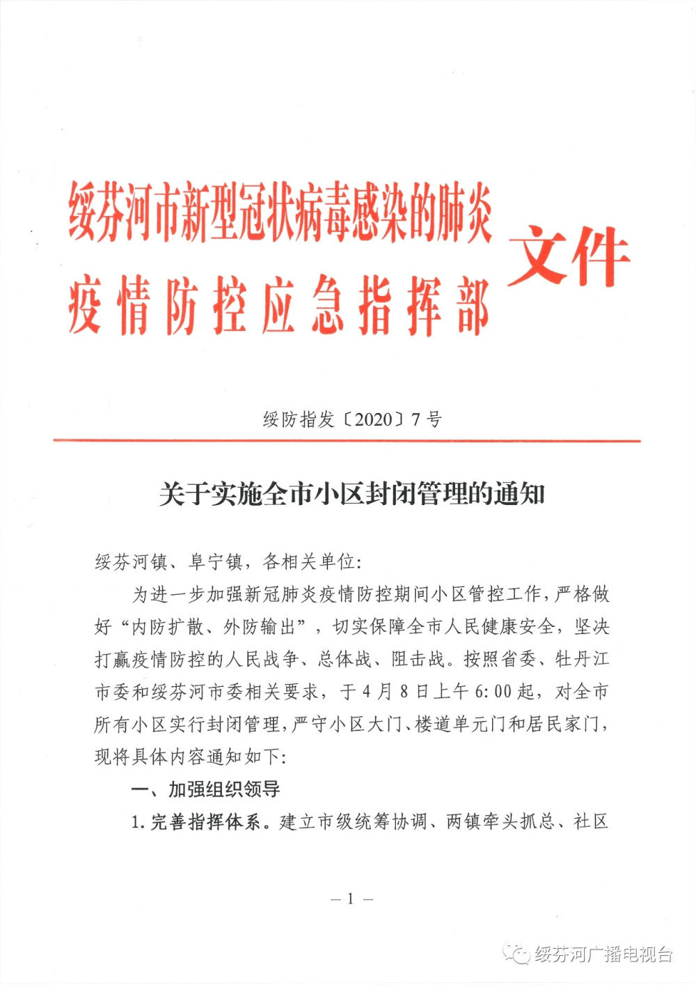 绥芬河市新冠肺炎疫情防控指挥部4月7日发布通知,为进一步加强新冠肺炎疫情防控期间的管控工作,严格做好“内防扩散,外防输入”,位于黑龙江省中俄边境的绥芬河市所有小区自4月8日6时起实行封闭管理,严守小区大门、楼道单元门和居民家门。