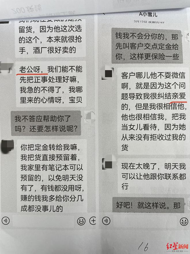 对于周某的暧昧信息,老何窃喜之下给予了回应,“挺想你的,小宝贝!”得到老何的暧昧回复后,“A小雪儿”更是一口一个“亲爱的”,“你是愿意帮我咯,宝贝!”周某开始让老何帮忙倒卖白酒“赚差价”。