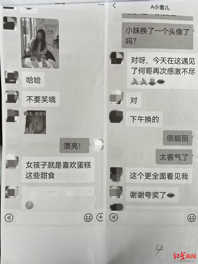 两人微信聊天内容,很快从白酒质量聊到生活层面。聊着聊着,“A小雪儿”给老何发来一张正在吃甜品的生活照。在得到老何“漂亮”两字的回应后,“A小雪儿”突然回复了一句暧昧的话。