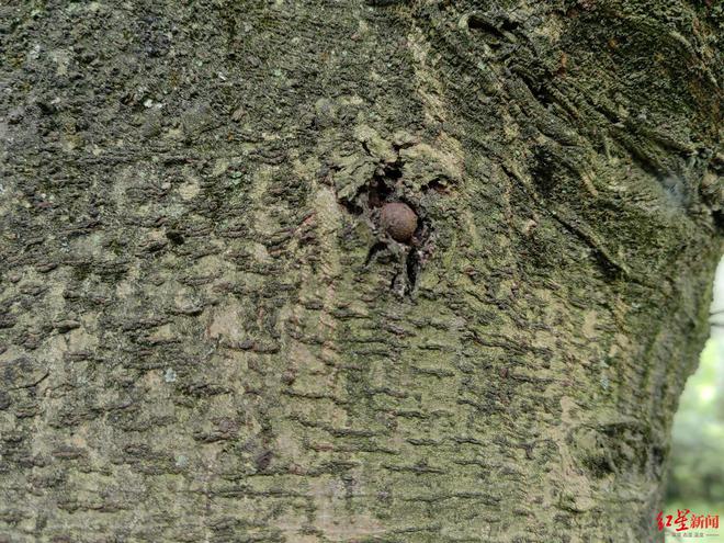 大家还注意到,有的弹孔和弹珠出现在树木的东北方向,与新碧园小区遭受枪击的位置刚好相反。他们分析,开枪的位置就在这片绿地范围内,“可能是有人非法打鸟,子弹飞到了小区”。