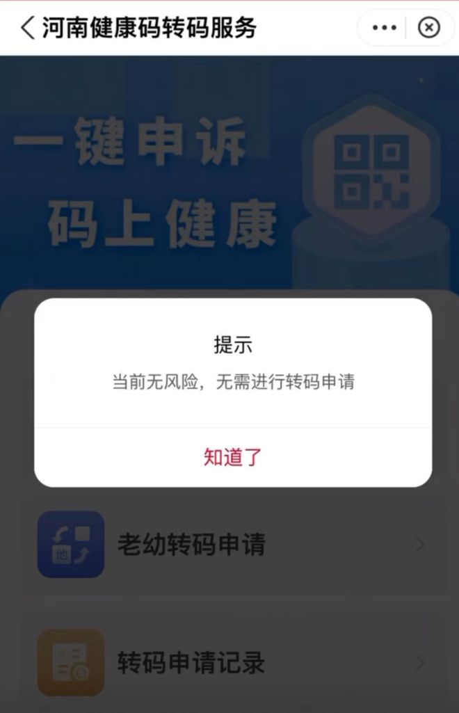 成都储户廖女士6月13日来郑州被赋红码后,睡了一天马路。她曾在6月14日上午点击豫康码上申请转码的链接,却被系统告知“当前无风险,无需申请转码”。